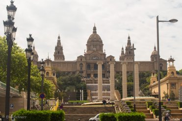 Da die Sonne es heute wieder besser mit uns meint, beschließen wir, noch einmal auf den Montjuïc hinauf zu fahren, und laufen vorbei am Palau National, wo der Magische Brunnen sich heute ausschweigt und weiter bis zur Talstation des Telefèric de Montjuïc.