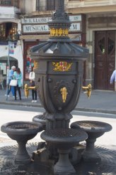 Zuerst kommen wir vorbei am Font de Canaletes: einer eisernen Wasserstelle aus dem 19. Jahrhundert. Dies ist ein traditioneller mittäglicher Treffpunkt der Fans des FC Barca und der Legende nach kommt jeder, der aus diesem Brunnen trinkt, irgendwann wieder zurück nach Barcelona. Und da wir das durchaus vorhaben, trinken wir natürlich auch eine Schluck Wasser aus dem Brunnen