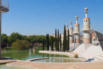 Wir steigen also in den nächsten freien Bus, bekommen auch einen Platz auf dem Oberdeck und fahren zunächst bis zur Station „Estacio de Sants“ wo wir uns den Parc de l´Espanya Industrial mit den interessanten Türmen anschauen:
