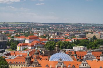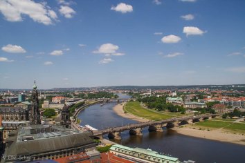 Da in der Kirche gerade ein Gottesdienst stattfindet, steigen wir zunächst in die offene Kuppel hinauf. Über einen Fahrstuhl und den Eselspfad (so wird der steinerne Weg nach oben genannt) sowie zwei weitere Treppenläufe gelangen wir zur 67 Meter hoch gelegenen Aussichtsplattform, wo wir einen wundervollen Rundblick über Dresden genießen.