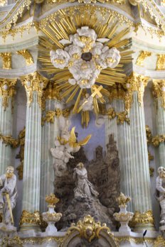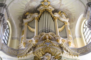 Mittlerweile ist es 13:00 Uhr und die Frauenkirche ist wieder für Besucher geöffnet. Wir betreten den Kirchenraum und sind total verblüfft: Sind wir sonst von Kirchen eher einen kühle, dunkle Atmosphäre gewohnt, präsentiert sich das Innere hier in freundlichen, hellen Pastellfarben und strahlt eine ganz eigene Schönheit aus. Mit den marmorierten Säulen und zahlreichen vergoldeten Details ist es eine wirklich gelungene Rekonstruktion der ursprünglichen barocken Gestaltung: