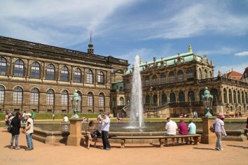 Hier schauen wir uns nur den Innenhof an — setzen uns auf die Wiese vor den Brunnen, genießen die Sonne und hören zu, was die Guides der vorbeilaufenden Touristengruppen Wissenswertes über den Zwinger erzählen.