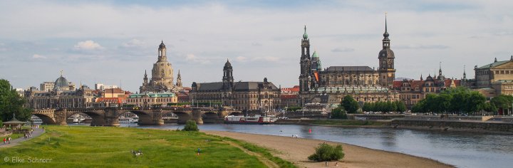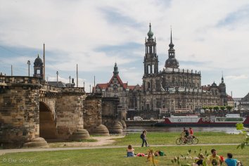 Wir laufen über die Augustusbrücke und spazieren am anderen Elbufer entlang, von wo wir einen schönen Blick auf die Kulisse der Altstadt haben.