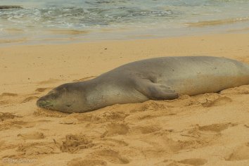 Ein Volunteer hat das Areal mit einem Band provisorisch abgesperrt, damit niemand der Robbe zu nahe kommt. Aber es gibt doch tatsächlich Leute, die sich darüber hinwegsetzen und dann sogar noch ausfällig werden, als man sie zurück pfeift. Wo haben die nur ihr Aloha gelassen…