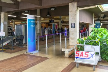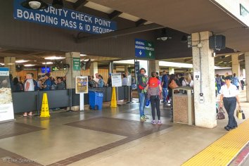 Dann geht es mit dem Shuttle die kurze Strecke zum Flughafen. Diesmal gibt es keine Automaten zum Einchecken sondern wieder einen Schalter, an dem wir unsere Banderolen für die Koffer bekommen. Abgeben tun wir das Gepäck dann ein paar Meter weiter wo alles einfach nur auf einen großen Haufen zusammengestellt wird.