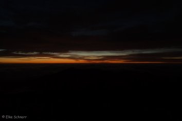Dann geht das Schauspiel los. Ganz langsam wird die Dunkelheit erst durch ein zartes helles Band am Horizont unterbrochen, dann wird es von Minute zu Minute zaghaft heller.