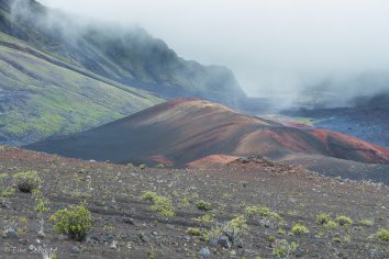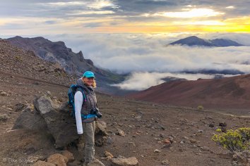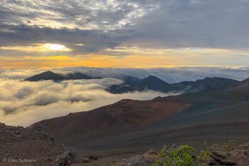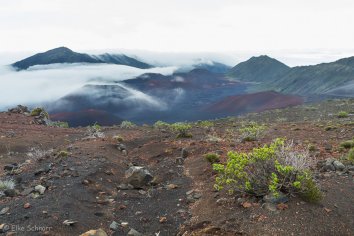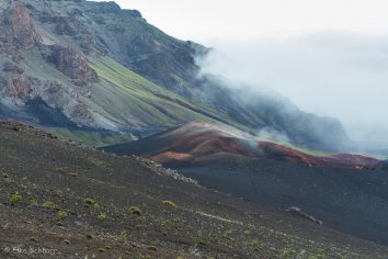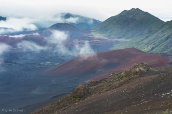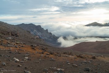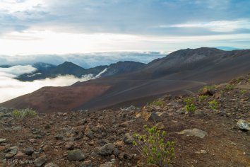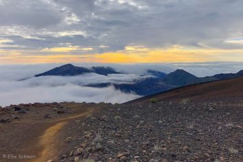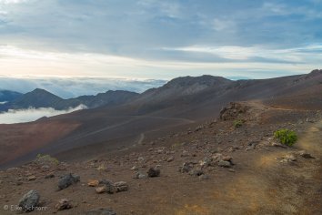 Schon wenige Meter nach Beginn des Trails beginnt sich der riesige Haleakala Krater unter unseren Füßen auszubreiten. Eine gewaltige Szenerie, die durch die tiefliegenden Wolken und die hochaufragenden Kraterwände irgendwie mystisch wirkt. Die Lava formiert sich dabei zu einem unglaublichen Farbenspiel und wir sind einfach nur begeistert.