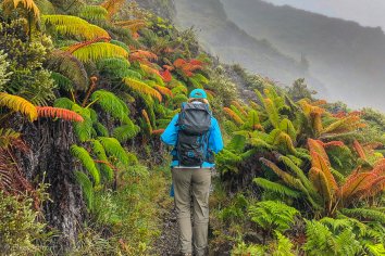 Der mittlerweile steinige Trail schlängelt sich durch saftiges Grün nach oben, aber für die vielen bunten Farne an den Hängen habe ich bei dem permanenten Regen gar keinen richtigen Blick mehr.