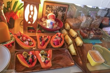 Leider gibt es keine große gemütliche Frühstücksrunde, wie wir das in B&B’s normalerweise kennen und mögen, sondern jeder bedient sich mehr oder weniger am Buffet und nimmt sein Essen dann mit auf’s Zimmer.