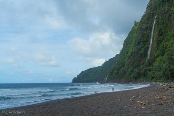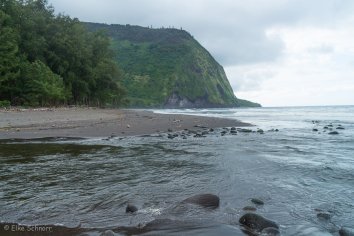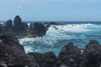 Gegen 14:00 Uhr fahren wir weiter und stoppen als nächstes kurz am Laupahoehoe Point — eine flache Halbinsel aus Lavagestein, die nach dem Ausbruch des Mauna Kea entstand. Wir beobachten eine Weile, wie die gewaltige Brandung auf die zerklüfteten Klippen donnert — hier ist definitiv kein Ort, wo man sich in’s Wasser wagen sollte.