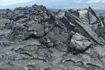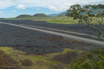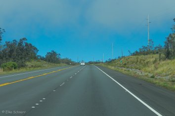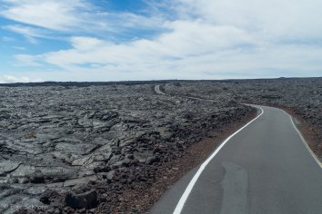 Die schmale und teilweise etwas unübersichtliche Straße schlängelt sich durch ein riesiges Lavafeld nach oben. Soweit wir schauen können, sehen wir nur Lava — frische und alte Lava, glatte glänzende Lava und große raue Brocken, graue, schwarze und braune Lava, A’a-Lava und Pahoehoe-Lava — einfach Lava in allen Formen und Farben.