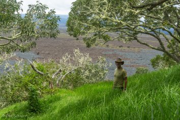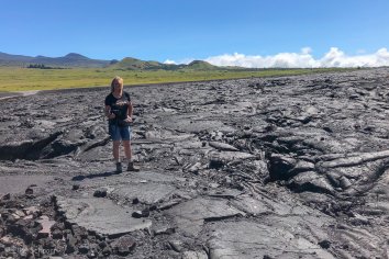 Der dadurch entstehende Kontrast zwischen dem intensiven Grün des Regenwaldes und der schwarzen Lava begeistert uns. Wir laufen eine große Runde um die Anhöhe herum, durchstreifen die interessante Landschaft, genießen die Ausblicke und Andreas findet sogar einen Geocache.