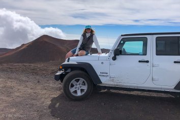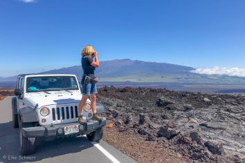 Immer wieder müssen wir anhalten, um diese unwirkliche Szenerie auf uns wirken zu lassen. Und natürlich um den Wahnsinnsblick auf den Mauna Kea zu genießen, den man von hier oben hat.