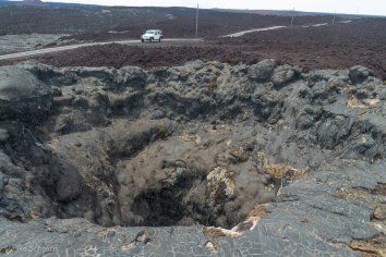 Wir fahren bis zum Parkplatz bei den Observatorien, ab dort ist die Straße leider gesperrt. Nach einer kurzen Pause drehen wir um und fahren die Observatory Road wieder nach unten. Auf dem Rückweg entdecken wir dann noch in der Nähe von Strommast Nr. 200 diesen Pitkrater, der 50 Fuß tief sein soll: