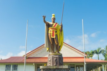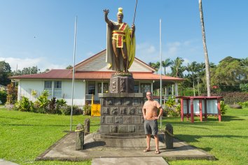 Die Strecke durch die Kohala Mountains ist landschaftlich recht abwechslungsreich und bietet tolle Ausblicke. Wir gönnen uns unterwegs allerdings nur einen kurzen Mini-Stopp in Kapa’au, um King Kamehameha die Hand zu schütteln. Naja, zumindest um die Original-Statue des großen Kriegers anzuschauen, der 1810 nach Jahren des Konflikts die hawaiianischen Inseln zu einem Königreich vereinte.