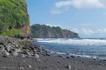 Uns erwartet eine dramatische Küste mit herrlichem schwarzen Sandstrand und großen polierten Lavasteinen. An Baden ist hier aufgrund der gefährlichen Brandung zwar nicht zu denken, aber es ist dennoch ein sehr malerischer Ort, um sich einfach nur hinzusetzen und eine Weile lang die Kräfte von Mutter Natur zu beobachten.