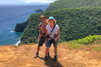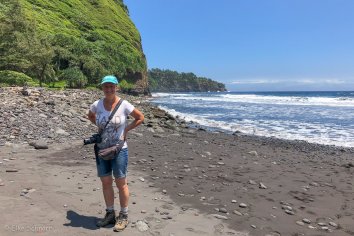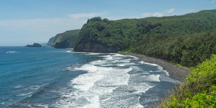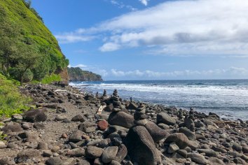 Der kurze, felsige Trail führt recht steil nach unten und obwohl der Auslösefinger unterwegs in jeder Kehre juckt und wir immer wieder anhalten um die atemberaubende Aussicht festzuhalten, erreichen wir bereits nach einer Viertelstunde den Pololu Beach.