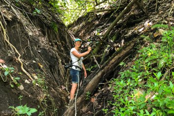 Wir laufen ein ganzes Stück am Strand entlang, bis auf der östlichen Seite des Tals ein weiterer Weg nach oben abgeht. Im Gegensatz zu vorhin, verläuft dieser jetzt durch die üppige Vegetation des Regenwaldes und ist dadurch ziemlich glitschig. Aber Andreas findet für mich in den Unmengen an herumliegendem Holz einen passenden Wanderstock, mit dem der Weg ganz gut zu laufen ist.