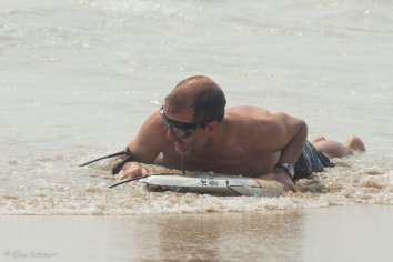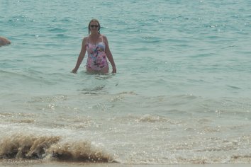 Zwar gibt es so gut wie keinen Schatten, aber da wir uns hauptsächlich im Wasser aufhalten, stört uns das jetzt auch nicht weiter. Wir baden abwechselnd und Andreas versucht sich ein bisschen mit dem Boogie Board.
