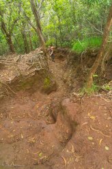 Nach dieser fantastischen Aussicht geht es zunächst ein kurzes Stück zurück, dann biegen wir in den Nualolo Cliff Trail ab, der eine Art Brücke zum Awa’awa’puhi Trail bildet. Der Cliff Trail war mehrere Jahre lang wegen unsicherer Bedingungen gesperrt, wurde aber in einer leicht modifizierten Version Ende letzten Jahres wieder freigegeben — gerade rechtzeitig für uns ![]()