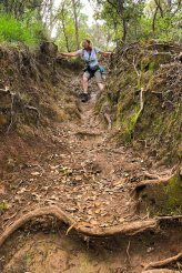 Durch den heftigen Regen der letzten Nacht ist der Weg wieder ziemlich matschig. Wir müssen ganz schön aufpassen, dass wir nicht in’s Rutschen kommen und entsprechend langsam laufen. Ein kleines bisschen erinnert uns das an unseren Horror-Abstieg vom Crouching Lion vor ein paar Tagen, nur mit dem Unterschied, dass es heute von oben trocken ist.
