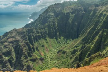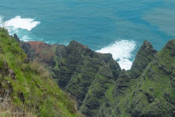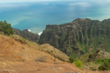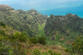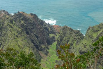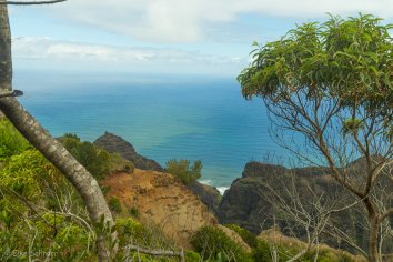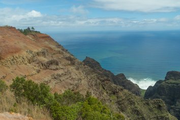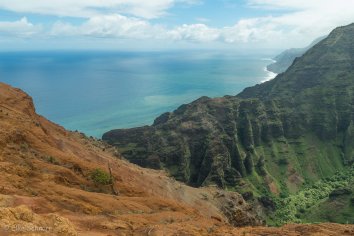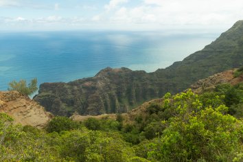 Schließlich erreichen wir am Ende des Nualolo Trails den Lolo Vista Aussichtspunkt. Von hier hat man einen fantastischen Blick auf die Na Pali Coast und wir legen eine Viertelstunde Pause ein, um diesen ausgiebig zu genießen.