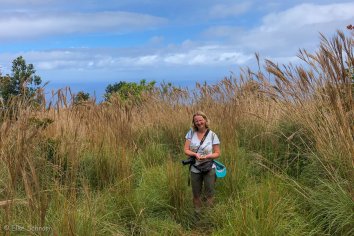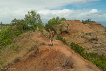 Der Cliff Trail ist im Gegensatz zum Nualolo Trail größtenteils trocken und deutlich weniger spektakulär. Aber er ist doch recht abwechslungsreich — führt teilweise durch mannshohe Gräser, fordert die ein oder andere Klettereinlage und bietet auch ein paar nicht ganz unnette Ausblicke…