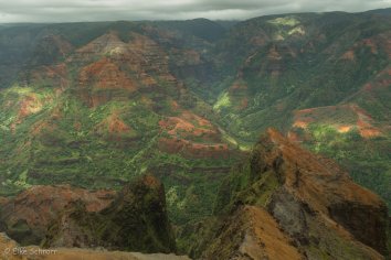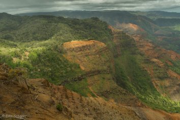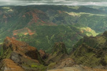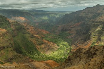 Ein zweiter Versuch mit einem Stopp am Waimea Canyon Lookout ist nicht viel überzeugender. Auch hier liegt schon alles im Schatten. Aber macht nichts, wir werden ja während unseres Aufenthaltes auf Kauai mit Sicherheit noch einmal in den Waimea Canyon kommen.