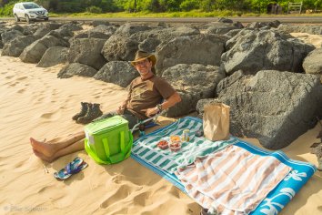 In Waimea kaufen wir uns im Ishira Market eine Auswahl an Poke und fahren damit zum Kekaha Beach. Hier machen wir es uns am Strand gemütlich, verspeisen den köstlichen Fisch und beobachten dabei die mächtigen Wellen.