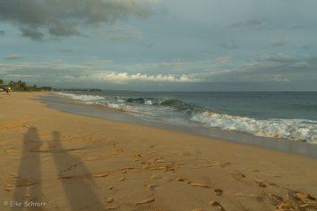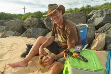 Nicht weit von der Stelle, an der wir uns niedergelassen haben, entdecken wir im Sand eine frische Kokosnuss. Wir schnappen sie uns und Andreas schnitzt eine Viertelstunde an ihr herum, bis er sie endlich geöffnet bekommt. Schmeckt echt lecker!