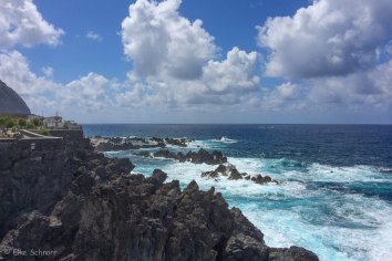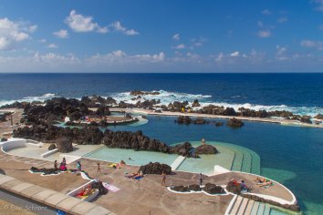 Nach nur kurzer Fahrt kommen wir zum nördlichsten Punkt der Insel: Porto Moniz — ein Ort, der für seine Naturpools berühmt ist, die das Meer hier seit Jahrtausenden in’s Lavagestein der Landzunge nagt.
