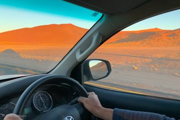 Dann fahren wir bis zum 2WD Parkplatz, wo Andreas wieder etwas Luft in die Reifen pumpt, bevor es auf dem Asphalt zurück geht. Auch hier und unterwegs scheinen wir mittlerweile die einzigen zu sein — selbst an der Düne 45 ist niemand mehr zu sehen. Wo sind nur all die Menschen hin, von denen es heute morgen hier nur so gewimmelt hat?