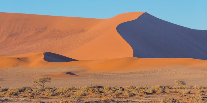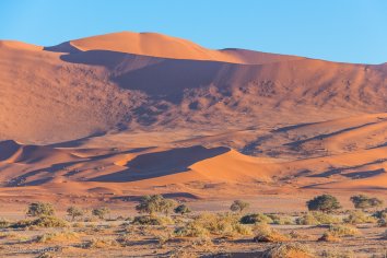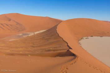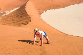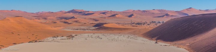 Die Menge teilt sich dann auf — eine Hälfte beginnt schnurstracks mit der Erklimmung von Big Daddy, die andere bewegt sich in Richtung Dead Vlei. Wir schließen uns der zweiten an, da wir das letzte Morgenlicht gerne noch für die toten Bäume haben möchten.