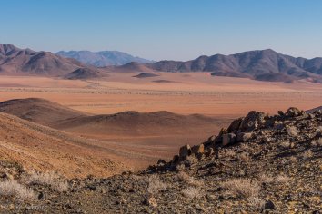 Über einen Sattel kommen wir auf die andere Seite des Horseshoe Mountain. Hier ändert sich die Landschaft ein wenig: es gibt kaum noch Dünen, stattdessen mehr Geröll und es ist rauer und steiniger.