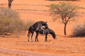 Dabei sehen wir im Gelände jede Menge Tiere: Elands, Springböcke, korpulierende Esel und Strauße, die sich in dem roten Kalahari-Sand außerordentlich fotogen präsentieren.