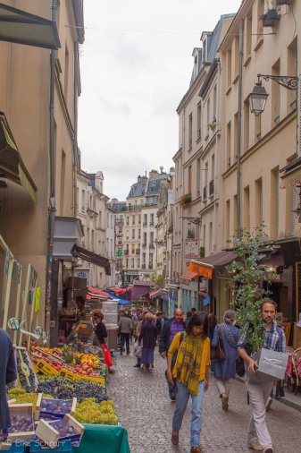 So biegen wir nach ein paar Querstraßen in die Rue Moffetard ein — eine krumme, enge Marktstraße, die bekannt ist für die vielen Stände und Läden, an denen vom Käse bis zu Früchten der Saison alles angeboten wird, was Frankreich an kulinarischen Genüssen zu bieten hat.