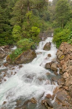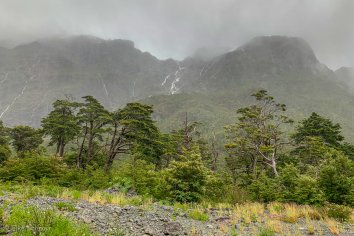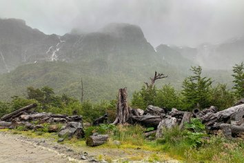 Später kommen wir durch das (zumindest laut Beschreibung im Reiseführer) wildromantische Tal des Río Simpson, von dessen Romantik wir allerdings durch den nach wie vor anhaltenden grauen Regenschleier nicht viel zu sehen bekommen.