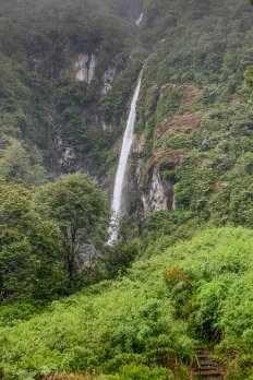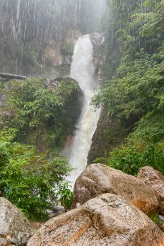 Aber wir sehen zumindest den ein oder anderen netten Wasserfall direkt von der Straße aus. An den Cascadas La Virgen ist das Aussteigen aus dem Auto, um ein Foto von selbigen zu machen, allerdings eine echte Herausforderung. Es schüttet mittlerweile kübelweise und ich bin nach den zehn Sekunden, die ich außerhalb des Autos zum Fotografieren verbringe, total durchgeweicht.