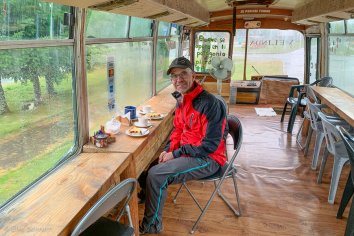 Als es dann kurzzeitig mal etwas langsamer regnet, halten wir in Villa Amengual für eine kurze Unterbrechung der Fahrt. Hier gibt es ein kleines Café in einem umgebauten und umfunktionierten alten Bus, in dem wir uns zwei Stück Kuchen und zwei Kaffee genehmigen.