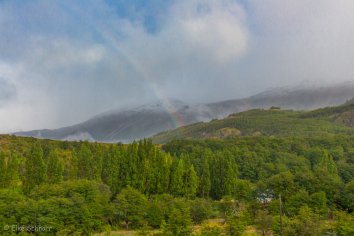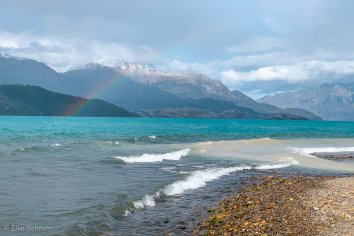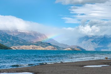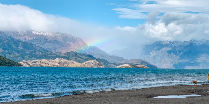 Als wir wieder aufgewärmt sind und die Sonne für heute endgültig die Oberhand gewonnen hat, gehen wir noch eine Runde am Ufer entlang spazieren. Über dem Lago General Carrera hat sich in der Zwischenzeit ein toller Regenbogen gebildet und das Wetter wird von Minute zu Minute freundlicher.