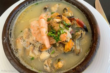 Zum Abendessen gibt es hier in Puerto Rio Tranquilo nicht wirklich viele Möglichkeiten. Am besten erscheint uns noch das Las Parvas, in dem wir dann schließlich auch landen. Andreas nimmt Lamm, ich einen Fischeintopf und beides ist recht lecker.