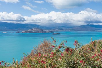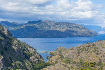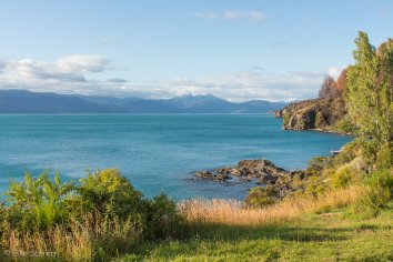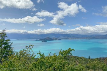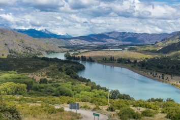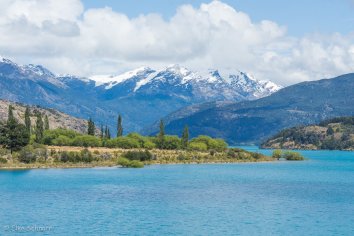 Die Strecke führt zunächst in teils abenteuerlichen Kurven entlang des Steilufers des einmalig schönen Lago General Carrera. Immer wieder öffnen sich dabei tolle Blicke auf dessen blaugrüne Buchten mit den Gipfeln des patagonischen Eisfeldes dahinter und wir halten an vielen Viewpoints.