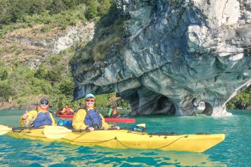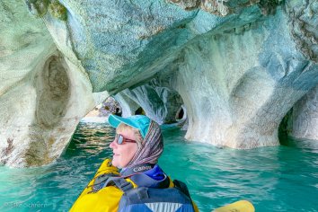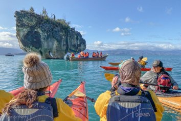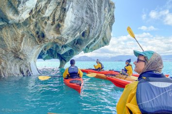 Nach einer kurzen Einweisung geht es dann in das fantastisch türkis-blaugrün-smaragdfarben schimmernde Wasser des Lago General Carrera und wir paddeln gemeinsam mit zwei Guides los in Richtung der Marmormassive.
