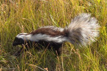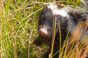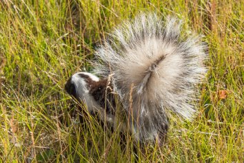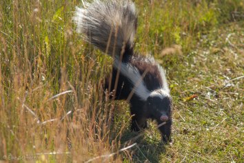 Später entdecken wir, wie sich im hohen Gras ein buschiger weißer Schwanz hin und her bewegt. Wir pirschen uns vorsichtig heran und nähern uns dem schwarz-weißen Etwas, was da im Boden herum buddelt.