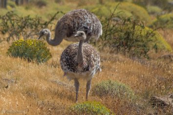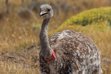 Von den vielen im Park vorhanden Vogelarten sehen wir unterwegs zum Beispiel ein paar Nandus. Einer von ihnen ist mit einem roten Halsband markiert und agiert recht aggressiv — er erinnert uns ein wenig an die angriffslustigen Strauße, die wir in Namibia erlebt haben.