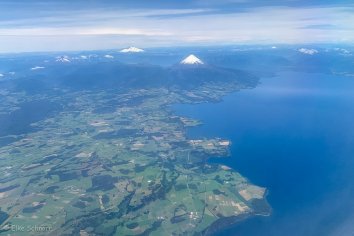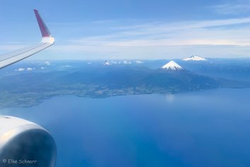 Mit einer halben Stunde Verspätung heben wir schließlich zum vorerst letzten Mal ab, genießen unterwegs schon mal tolle Ausblicke auf die wunderschöne Seenlandschaft mit den schneebedeckten Vulkanen…