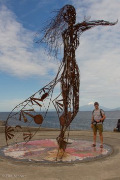 Wir laufen bis zum Nordende der Uferpromenade, wo eine große Metallskulptur steht. Diese soll die Prinzessin Licarayén darstellen, die wohl einer Legende zufolge dem Geist des Vulkans Osorno geopfert wurde.