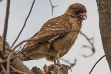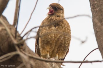 Auf dem Rückweg begegnen wir noch diesem putzigen Gesellen: Ein junger Chimangokarakara, der sich lautstark Gehör verschafft: