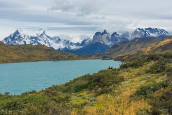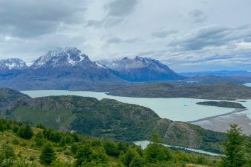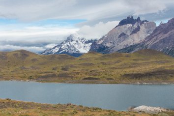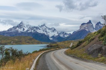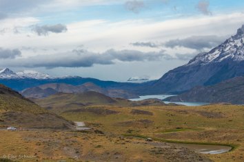 Aber nichtsdestotrotz ist die Fahrt spektakulär und bietet unterwegs grandiose Ausblicke — hier zum Beispiel am Lago Pehoe mit Blick auf unsere heutige Unterkunft, die wir aber vorerst einmal links liegen lassen.