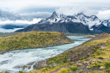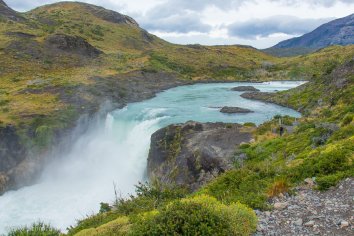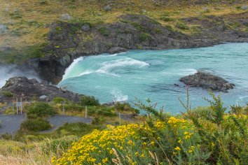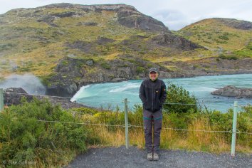 Hier laufen wir den sehr kurzen Weg zum Aussichtspunkt. Das türkis-blaue Wasser des Rio Paine stürzt tosend über die Felsen und dann etwa 15 Meter in die Tiefe. Recht beeindruckend.